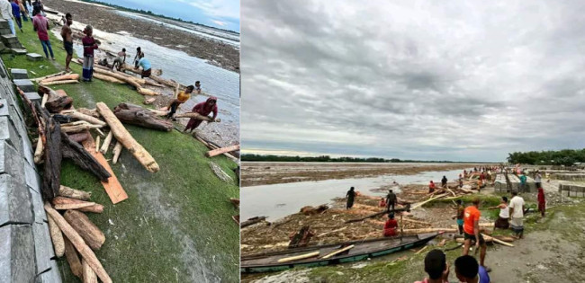 ভারী বৃষ্টিতে কুড়িগ্রামের কালজানি নদীতে ভেসে আসছে হাজার হাজার গাছ