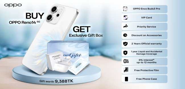 বাংলাদেশে রেনো১৪ ফাইভজিতে ১০০% উইন গিফটস অফার নিয়ে এলো অপো