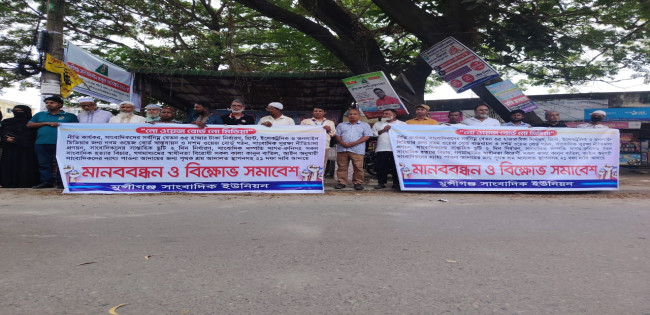 “নো ওয়েজ বোর্ড, নো মিডিয়া” স্লোগানে মুন্সীগঞ্জে সাংবাদিকদের মানববন্ধন